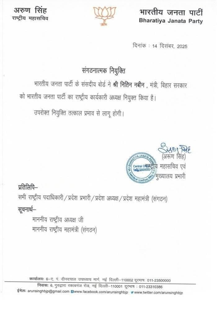 रायपुर, 14 दिसम्बर 2025: बीजेपी छत्तीसगढ़ प्रदेश प्रभारी तथा बिहार सरकार के लोक निर्माण मंत्री नितिन नवीन को बीजेपी का राष्ट्रीय कार्यकारी अध्यक्ष नियुक्त किया गया है।